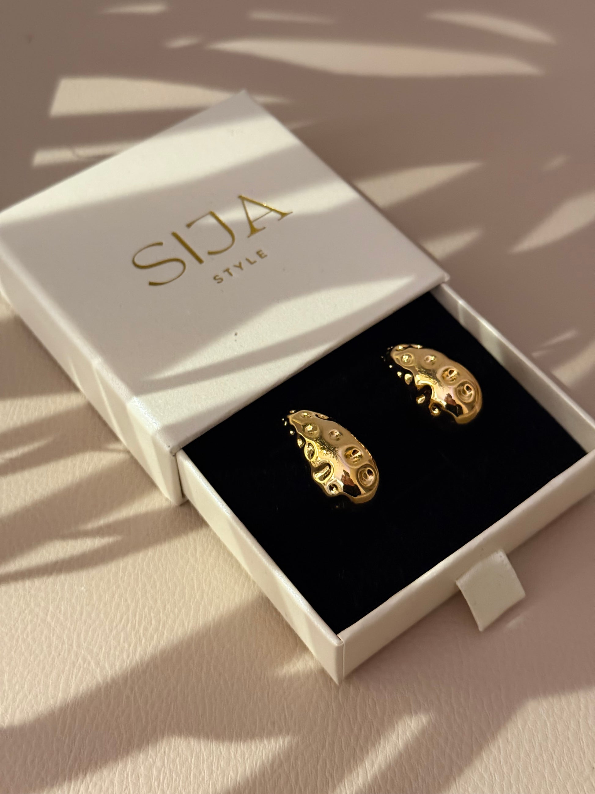 Šie auskarai pagaminti iš plieno dengto auksu – ne tik ilgaamžiai, bet ir draugiški jautriai odai. Nepaisant tvirtos medžiagos, auskarai yra lengvi ir patogūs dėvėti visą dieną.