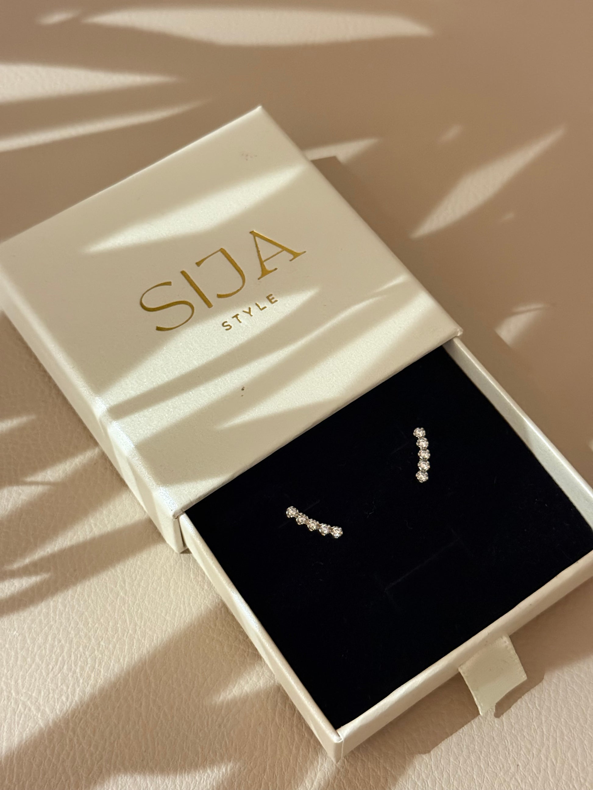 Išskirtinio dizaino auskarai, pagaminti iš hipoalerginio plieno – saugūs jautriai odai. Dekoruoti spindinčiais cirkoniais ir suformuoti dailia lenkta linija, kuri gražiai priglunda ir puošia ausį. Šis metalas yra ilgaamžis ir neoksiduojantis, todėl auskarai ilgai išlaikys savo pradinį spindesį. Lengvi, elegantiški ir universalūs – idealiai tinka tiek kasdienai, tiek ypatingoms progoms.