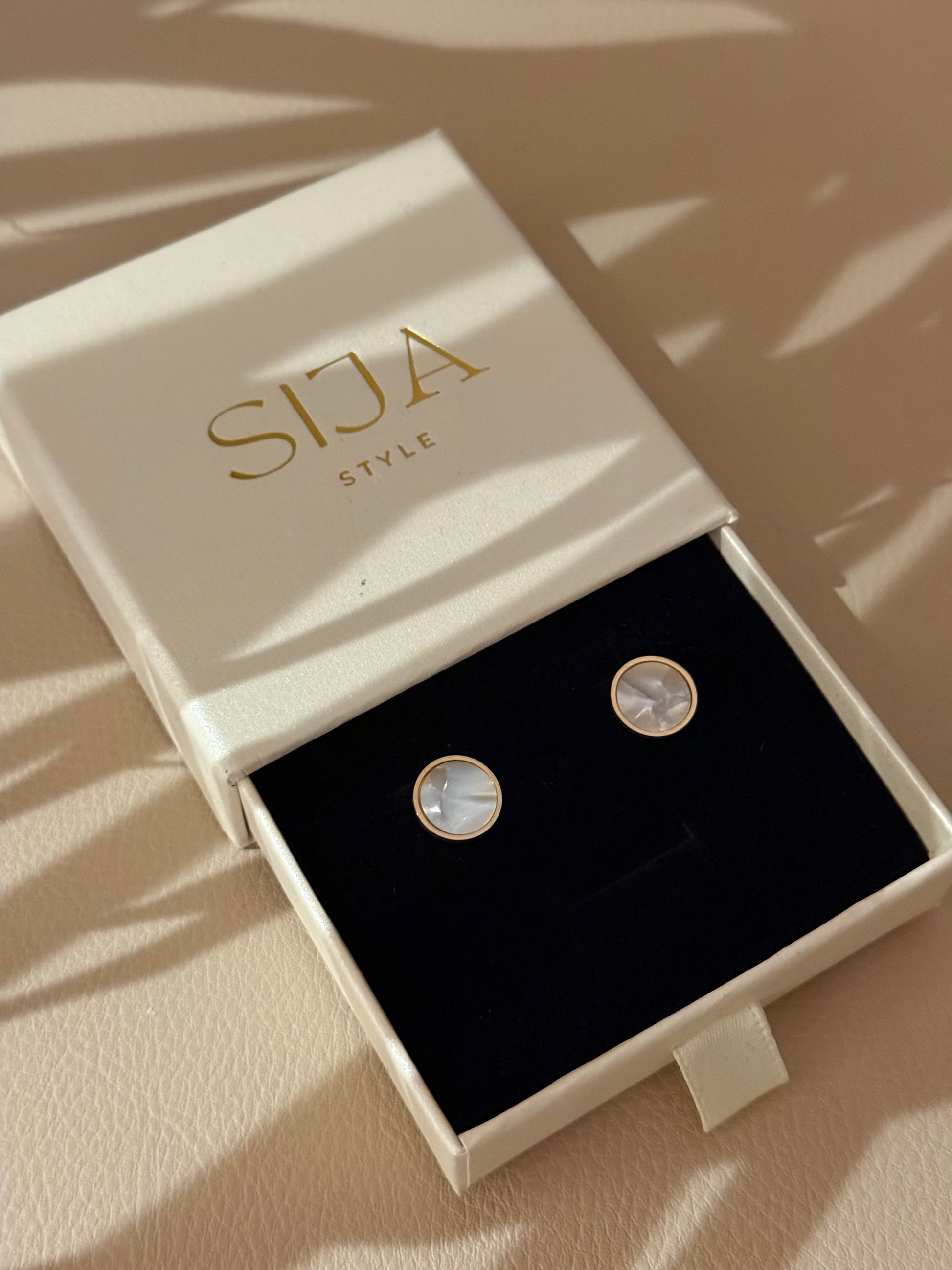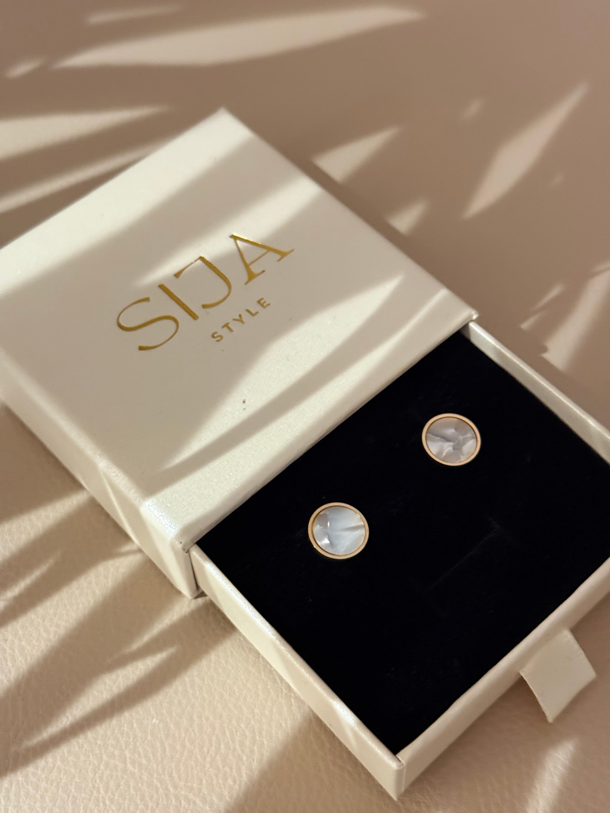 Auskarai pagaminti iš perlo kriauklės, kurios paviršius spindi nuostabiu perlamutru – natūraliu kalcio karbonato blizgesiu, sukurtu gamtos. Metalinės detalės iš paauksuoto nerūdijančio plieno, kuris nesukelia alergijos ir ilgai išlieka nepriekaištingos išvaizdos. Šie auskarai – elegantiškas ir subtilus akcentas, puikiai derantis tiek kasdienai, tiek ypatingoms progoms.