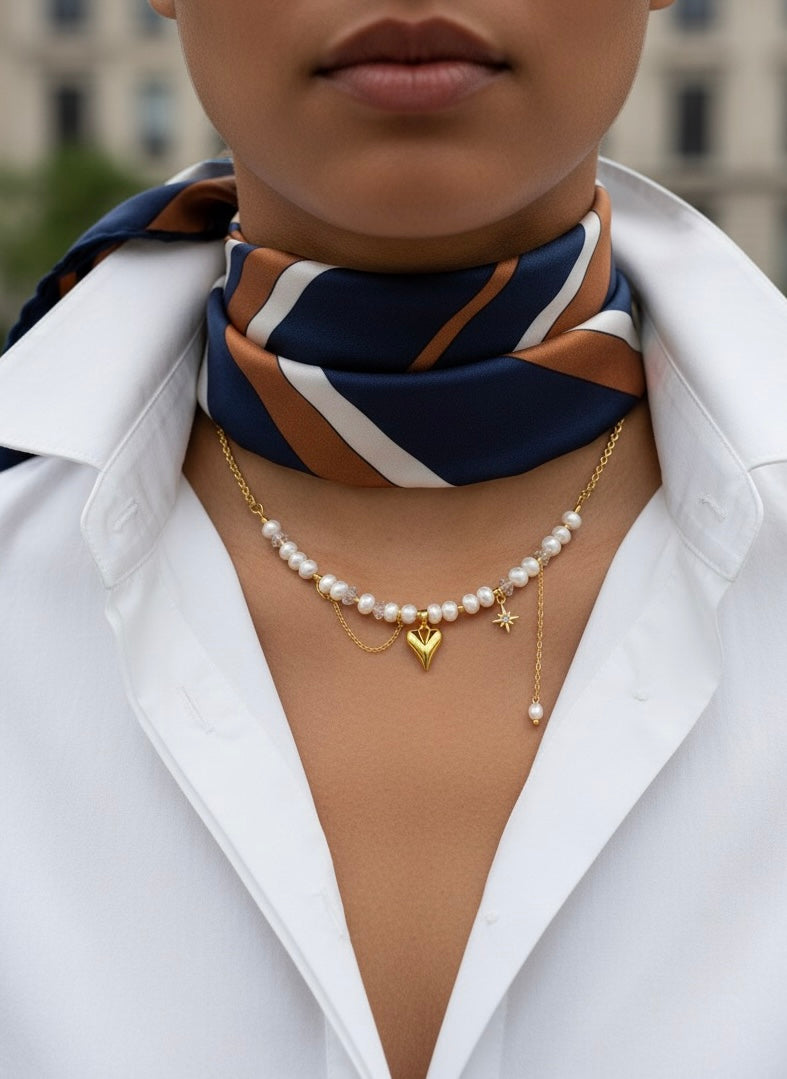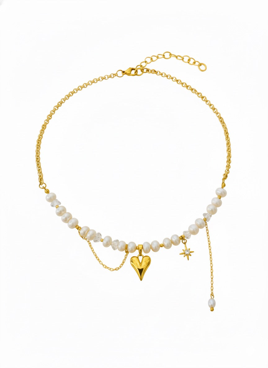 Išskirtinio dizaino rankų darbo vėrinys, kuriame dera natūralūs gėlavandeniai perlai ir paauksuota grandinėlė. Jį puošia du subtilūs akcentai – paauksuota širdelės formos pakabuko detalė ir žvaigždės formos pakabukas su spindinčiu cirkoniu.