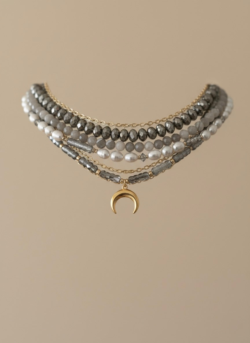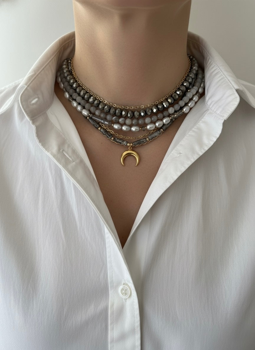 Masyvus ir žaismingas vėrinys, kuriame susijungia čekiškas stiklas, gėlavandeniai perlai, dryžuotas agatas, dažytas hematitas ir nerūdijantis plienas.