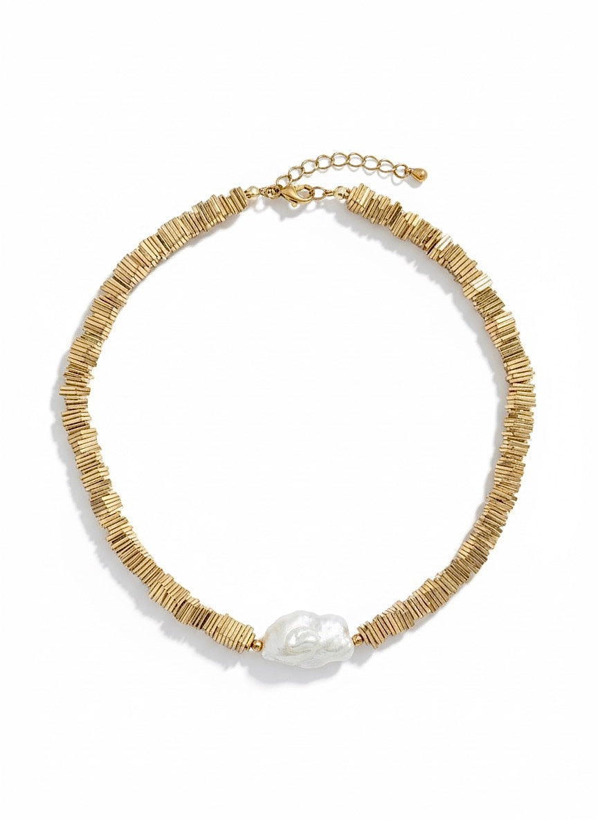 Išskirtinis elegancijos ir modernumo kontrastas – šiuolaikiškai madingas vėrinys, sukurtas iš hematito akmens ir prabangaus gėlavandenio baroko perlo.