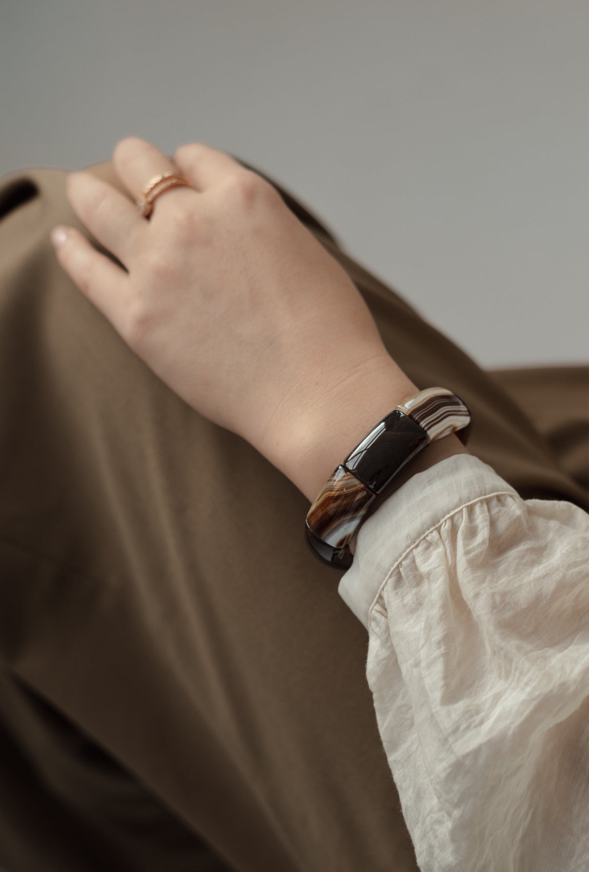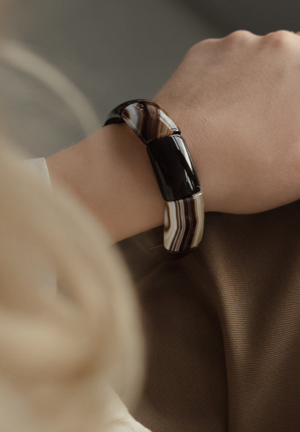 Išskirtinė masyvi apyrankė iš Agato akmens, suverta ant stipraus elastingo siūlo, todėl ją patogu užsidėti ir nusiimti. Agatas garsėja savo dvasinėmis savybėmis – suteikia vidinę ramybę, stiprina pasitikėjimą savimi, skatina kūrybiškumą ir saugo nuo neigiamos energijos. Šiuo metu ruda spalva ypač madinga, todėl ši apyrankė ne tik stilinga, bet ir išskirtinė detalė jūsų įvaizdyje.