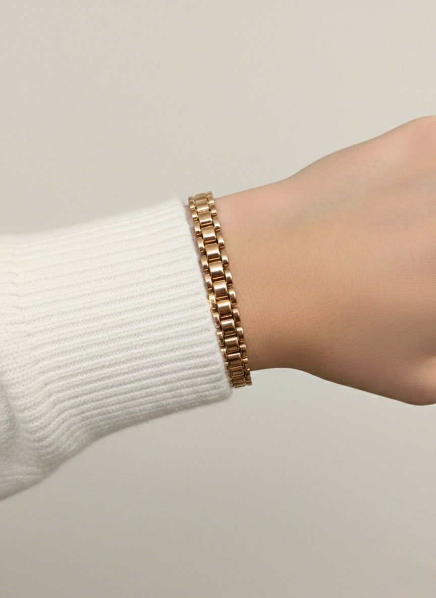 Apyrankė pagaminta iš aukštos kokybės, hipoalerginio nerūdijančio plieno, dengto auksu. Dizainas primena laikrodžio grandinėlę – šiuo metu itin populiarų stilių, harmoningai derinantį klasikos eleganciją ir modernų charakterį.