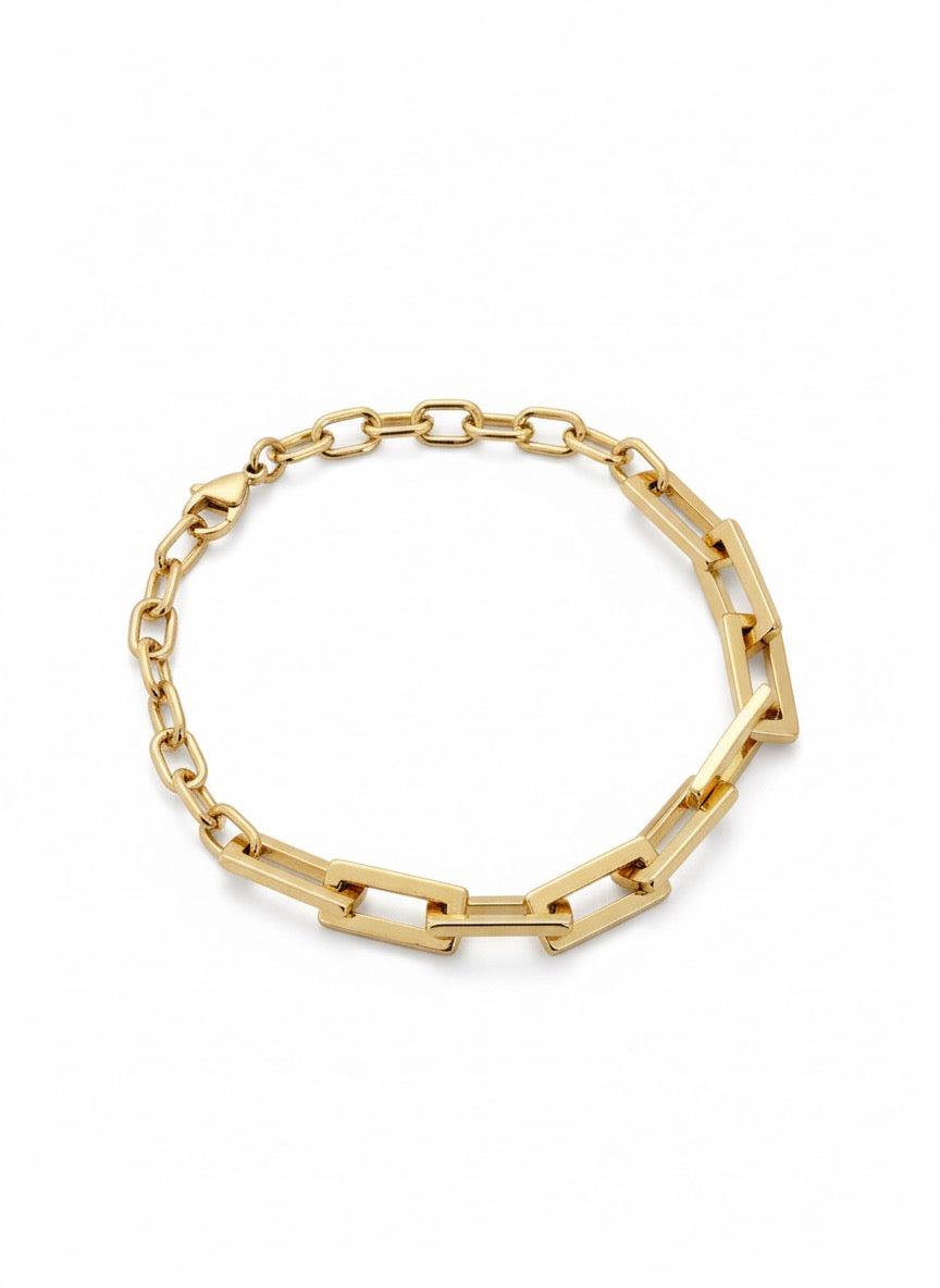 Stilinga grandinėlės tipo apyrankė, pagaminta iš aukštos kokybės nerūdijančio plieno dengto storu aukso sluoksniu. Stilingas dizainas su standartiniu užsegimu suteikia jai elegancijos bei patogumo kasdien dėvint. Ši apyrankė spindi šilto aukso atspalviu ir puikiai papildo tiek minimalistinį, tiek prabangų įvaizdį – universalus aksesuaras, kuris visada atrodo stilingai.