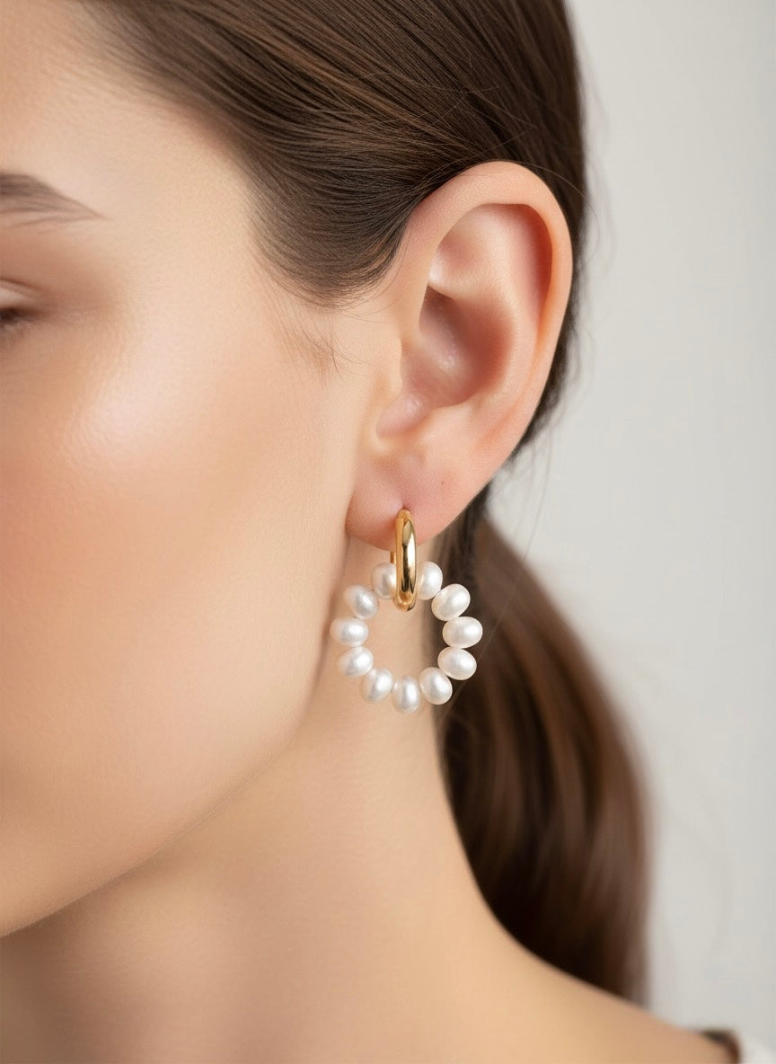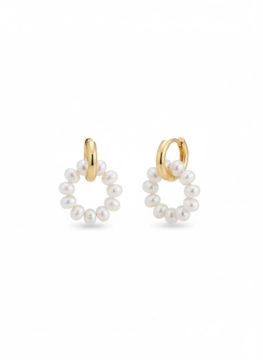 Elegantiški auskarai su paauksuota rinkute iš nerūdijančio plieno, papuošti subtiliais gėlavandenių perlų akcentais. Išskirtinis ir prabangus dizainas, kuris prideda rafinuotumo bet kokiai aprangai. Auskarai sukurti Ugnės Pumputės.