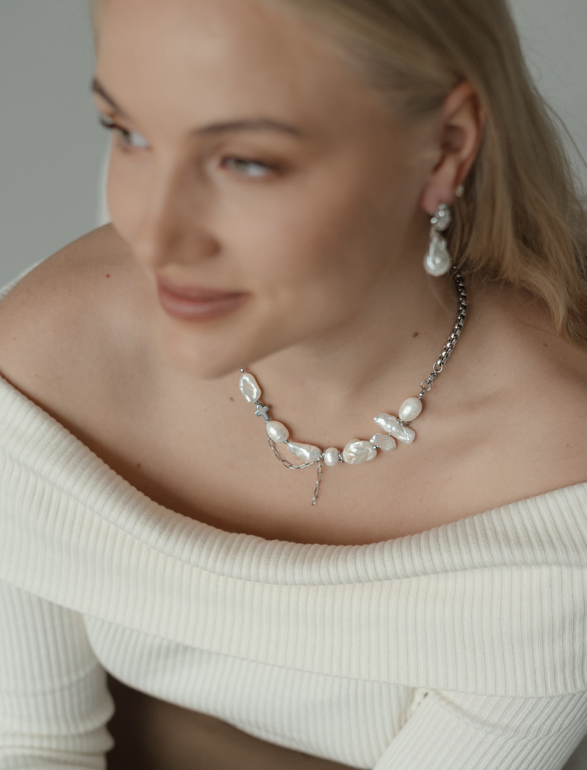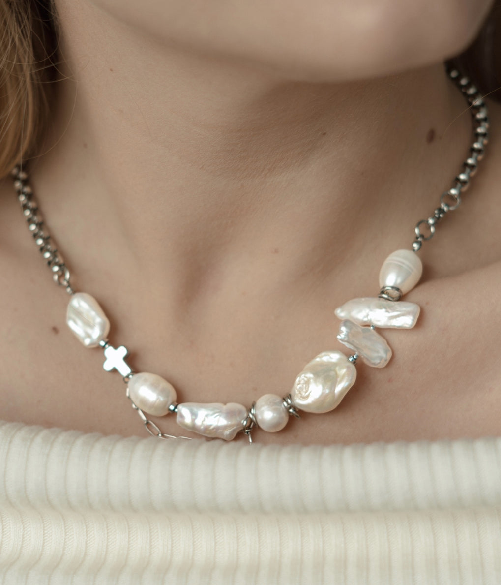 Vėrinys, sukurtas ir sumodeliuotas Ugnės Pumputės – išskirtinis ir stilingas papuošalas, traukiantis akį savo netikėtu dizainu. Rankų darbo kūrinys pagamintas iš natūralių gėlavandenių perlų, hematito akmens ir nerūdijančio plieno detalių. Klasikinio perlų žavesio ir šiuolaikiškų medžiagų derinys suteikia vėriniui modernų, bet kartu elegantišką įvaizdį. Tai subtilus, bet drąsus akcentas, puikiai tinkantis tiek kasdienai, tiek ypatingoms progoms.