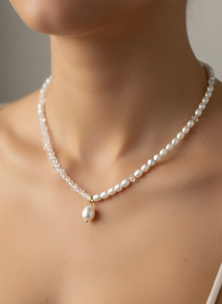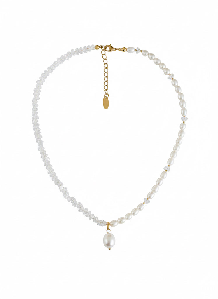 Vėrinys pagamintas iš natūralių gėlavandenių perlų, žvilgesiu garsėjančio čekų stiklo ir ilgaamžių nerūdijančio plieno detalių.