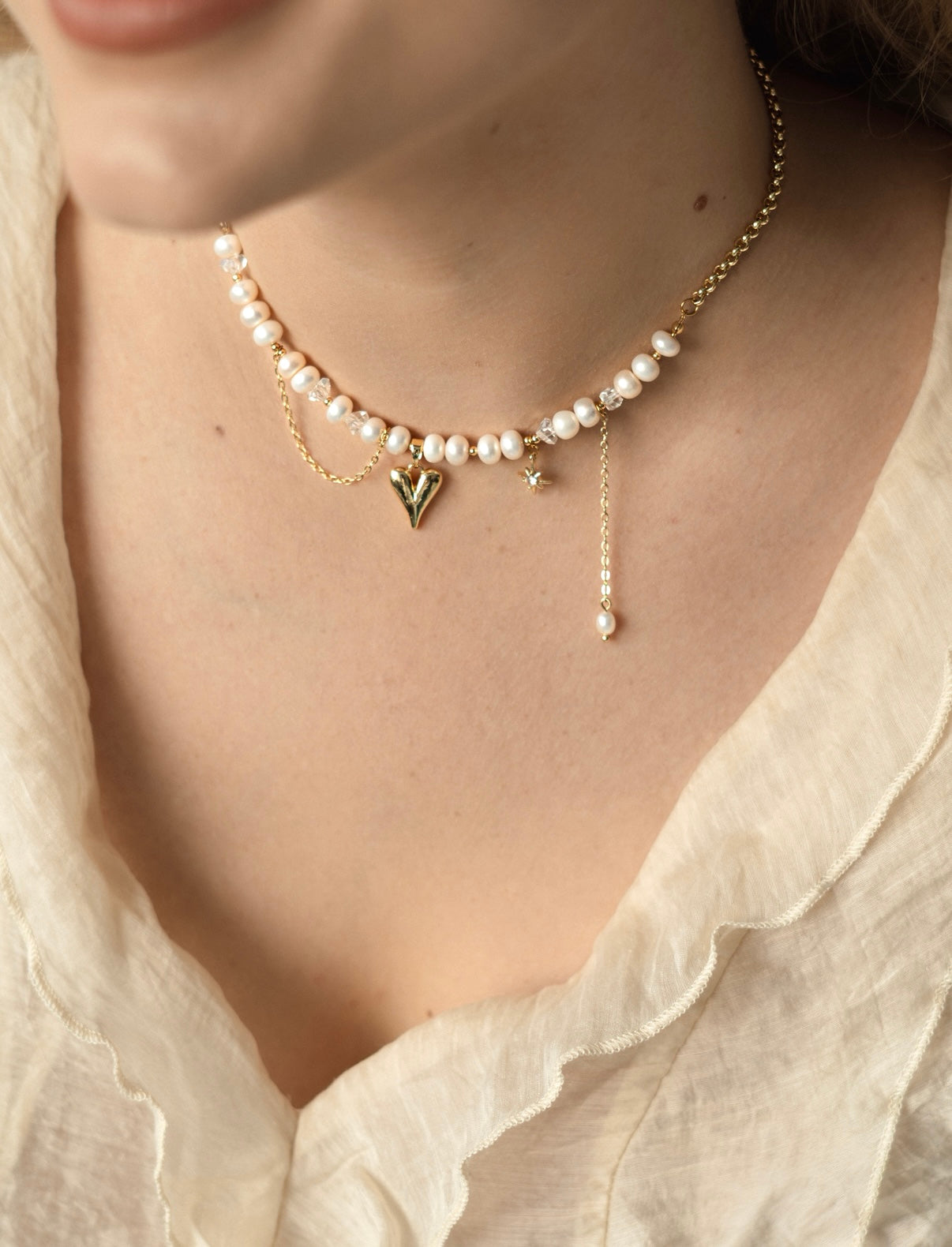 Išskirtinio dizaino rankų darbo vėrinys, kuriame dera natūralūs gėlavandeniai perlai ir paauksuota grandinėlė. Jį puošia du subtilūs akcentai – paauksuota širdelės formos pakabuko detalė ir žvaigždės formos pakabukas su spindinčiu cirkoniu.