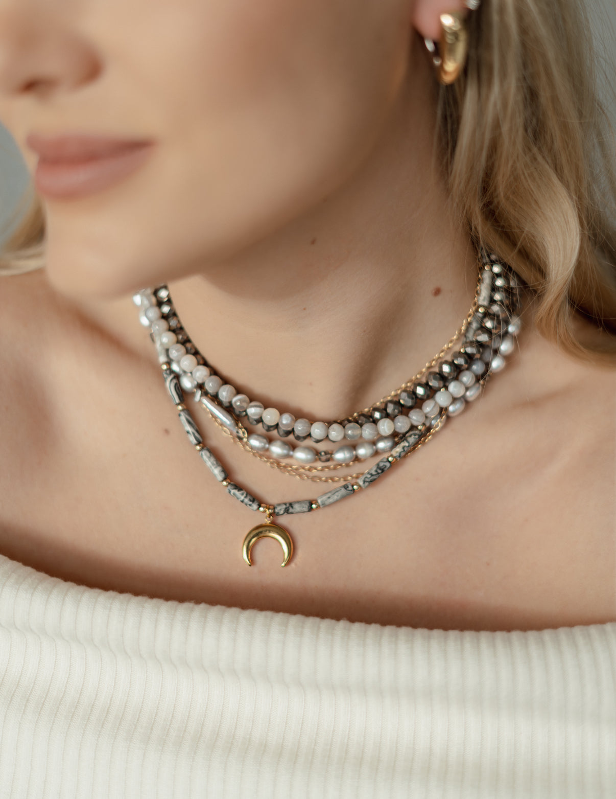 Masyvus ir žaismingas vėrinys, kuriame susijungia čekiškas stiklas, gėlavandeniai perlai, dryžuotas agatas, dažytas hematitas ir nerūdijantis plienas.