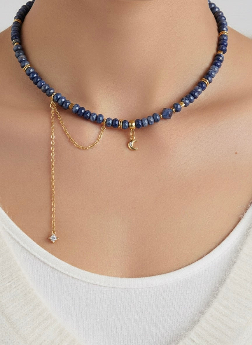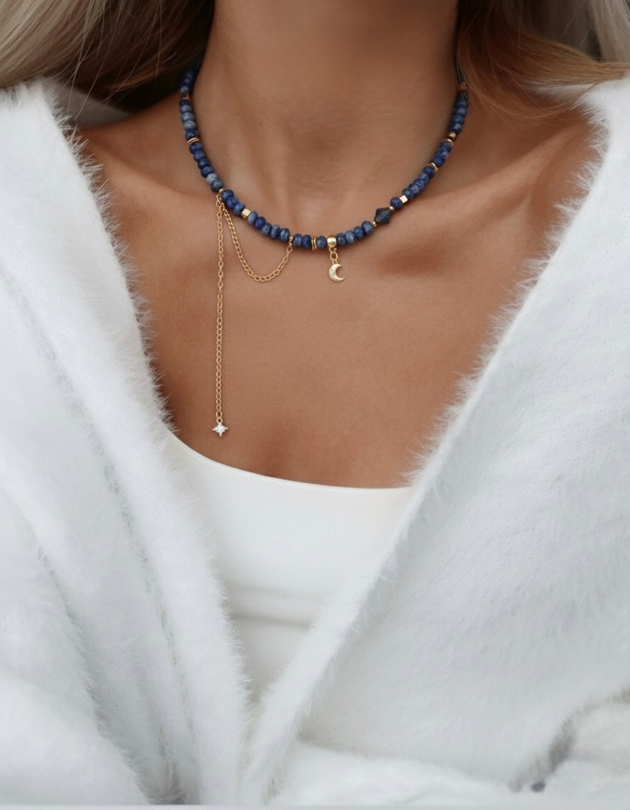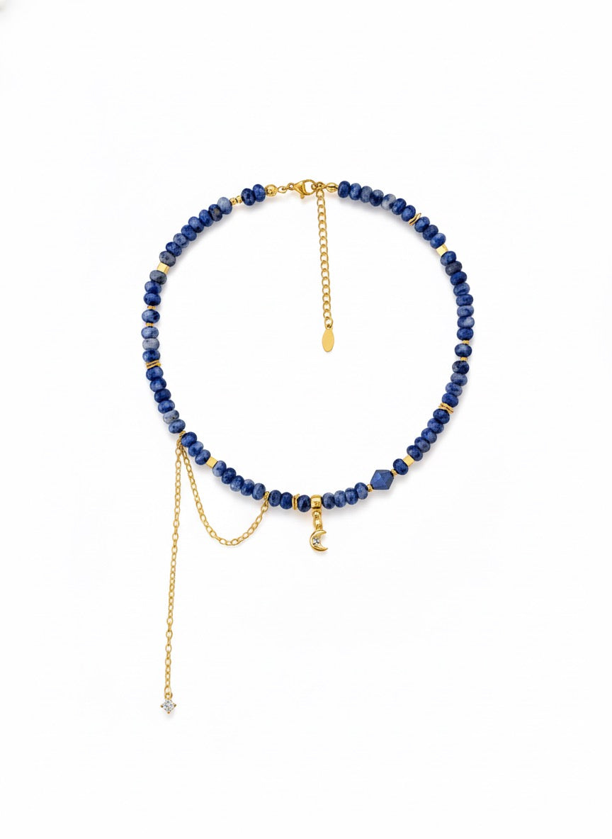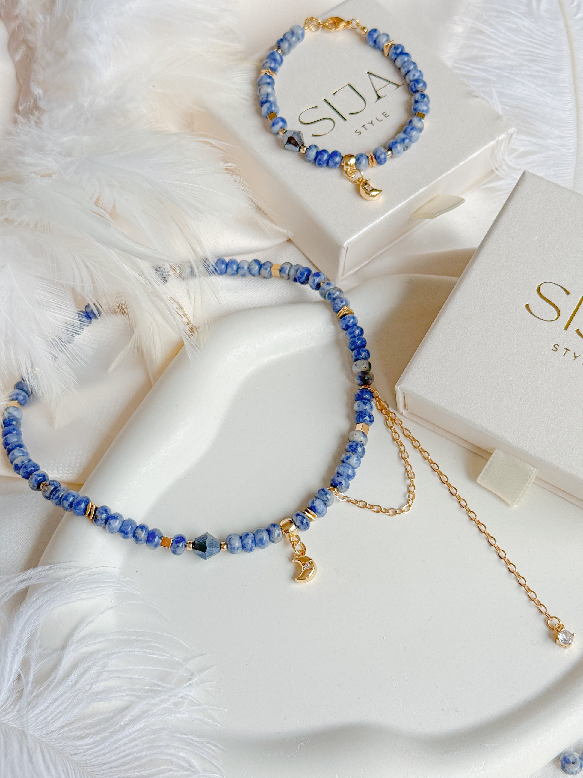 Elegantiškas ir žavingas vėrinys iš mėlynojo dėmėtojo jaspio – pusbrangio kristalo, simbolizuojančio ramybę, intuiciją ir vidinę harmoniją. Tikima, kad jis gali atnešti į jūsų gyvenimą apsaugą, meilę, sėkmę ir džiaugsmą. Vėrinį papuošia subtilūs paauksuoti hipoalerginio nerūdijančio plieno elementai, suteikiantys elegancijos ir išskirtinumo. Sukūrė ir projektavo Ugne Pumpute.