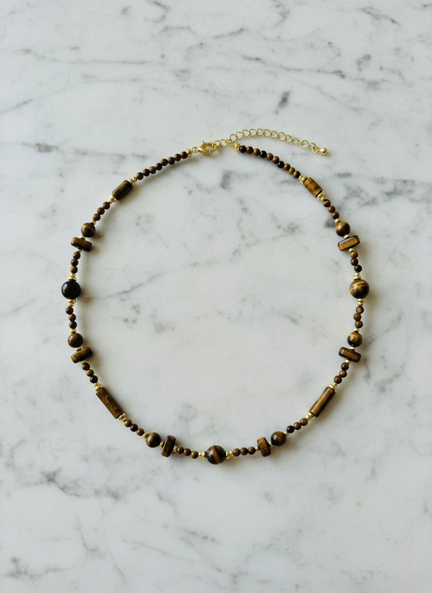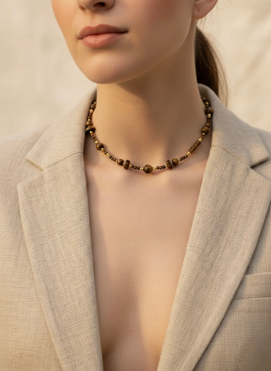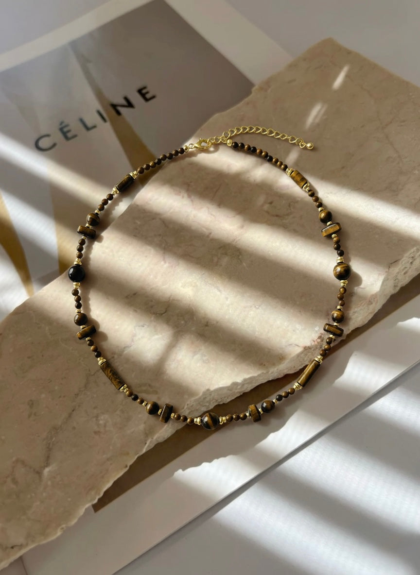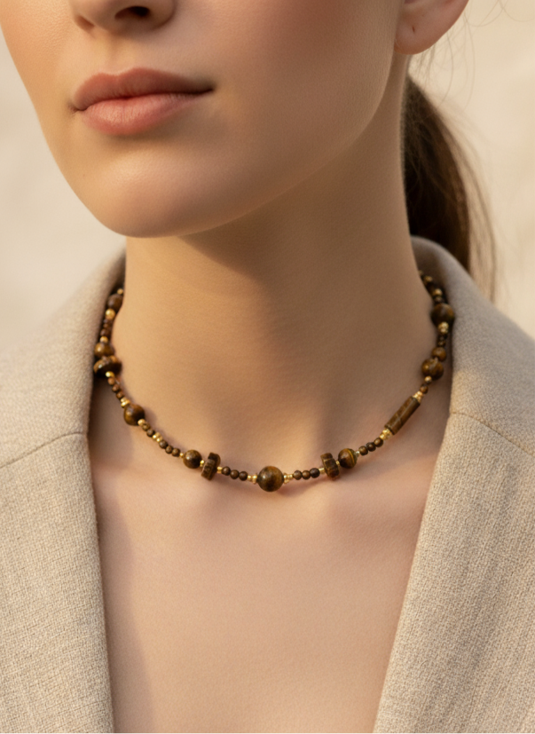 Vėrinys pagamintas iš Katės akies akmens, dar vadinamo šatrojantu, garsėjančio savo dvasinėmis galiomis – manoma, kad jis stiprina intuiciją, saugo nuo neigiamos energijos ir suteikia vidinės ramybės. Detalės – iš nerūdijančio plieno, padengto auksu. Itin stilingas papuošalas, ypač dabar, kai žemiški rudi atspalviai yra viena karščiausių tendencijų.