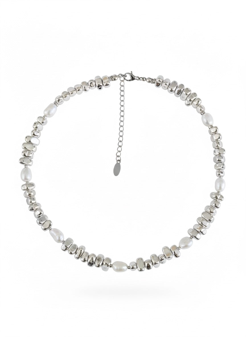 Išskirtinis vėrinys, kuriame dera sidabro atspalviu dengti hematito akmenys ir natūralūs gėlavandeniai perlai – tai šiuolaikiško šaltumo ir nesenstančios elegancijos jungtis.