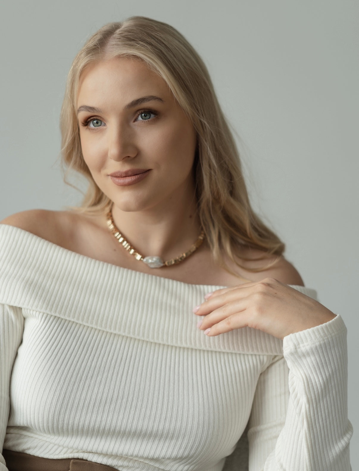 Išskirtinis elegancijos ir modernumo kontrastas – šiuolaikiškai madingas vėrinys, sukurtas iš hematito akmens ir prabangaus gėlavandenio baroko perlo.